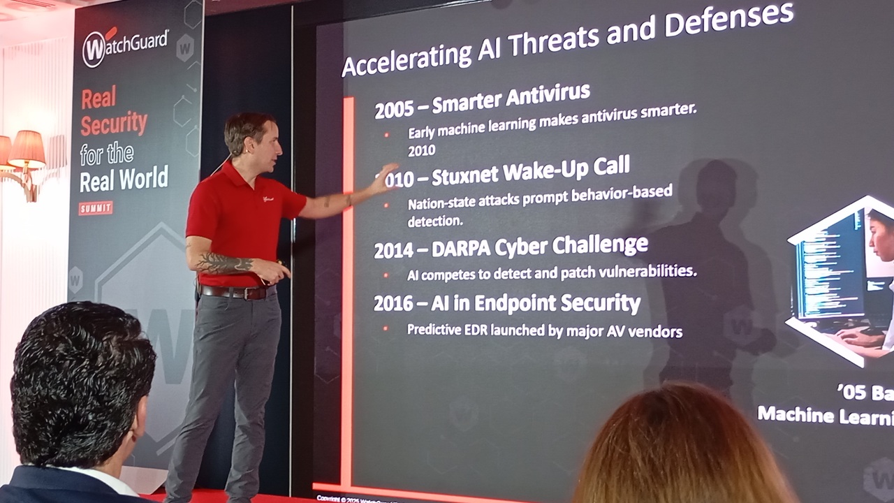 Por su parte, Marc Laliberte, director de Security Operations en WatchGuard, ofreció un repaso de la evolución de las plataformas de seguridad y también de la inteligencia artificial vinculada a la ciberseguridad hasta llegar al contexto actual. Un viaje hacia el contexto Zero Trust, hacia el uso de la IA generativa tanto en la defensa como en el ataque. Y hacia un futuro tan próximo como 2027 en el que ya haya campañas con ciberataques completamente autónomos a través de los agentes de IA.